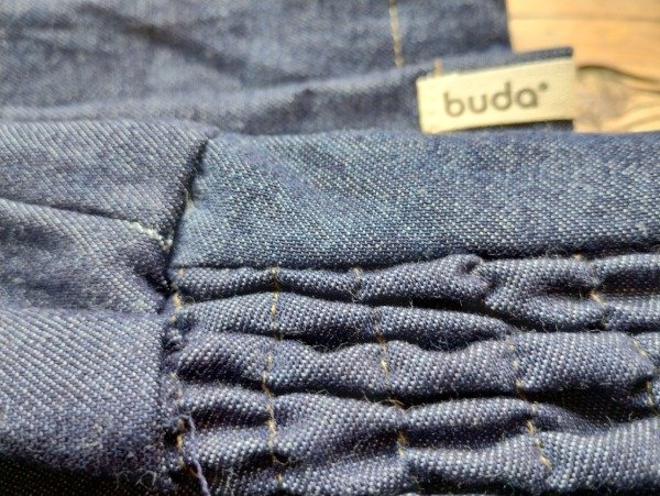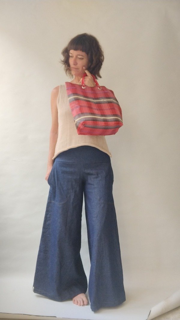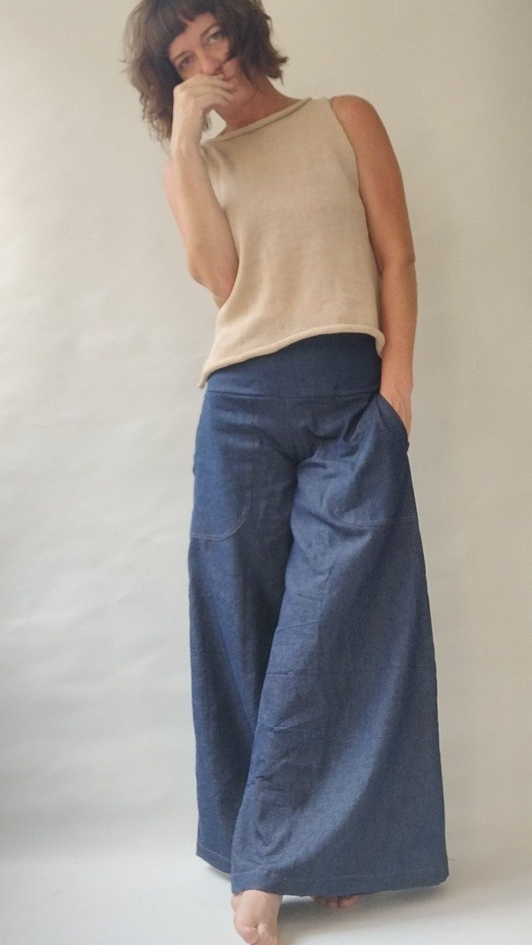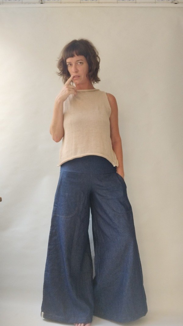 El buda pant denim es un palazo de jean azul camisero, una tela liviana, firme.