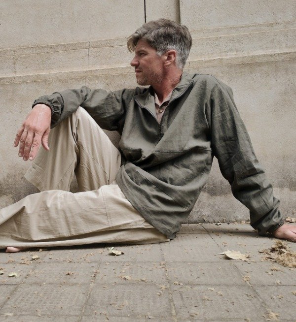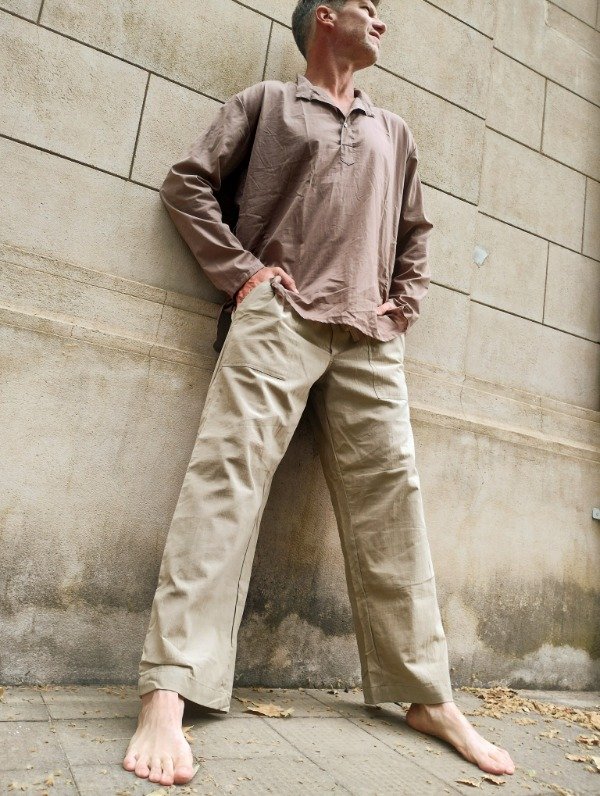 El buda recto es un pantalón unisex de tusor liviano. Tiene elástico en la parte de atrás de la cintura y un cordón ajustable en la parte de adelante.